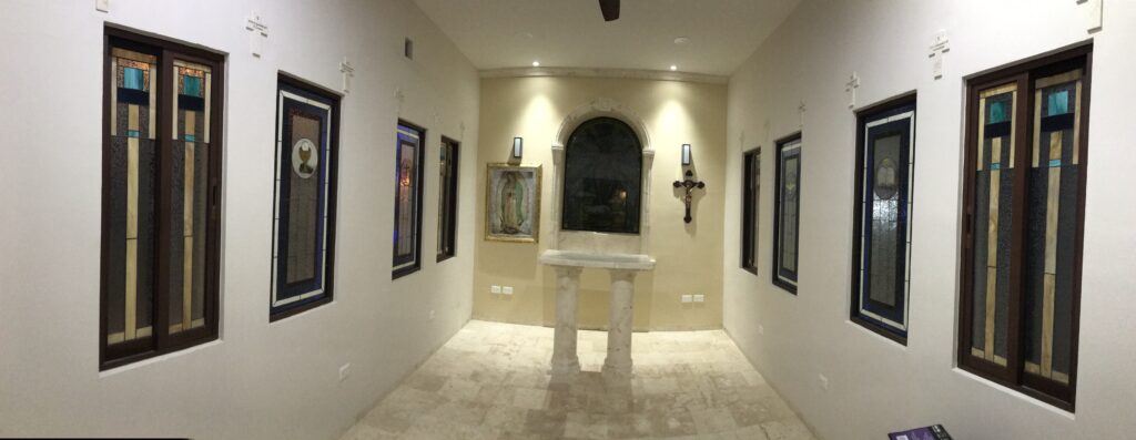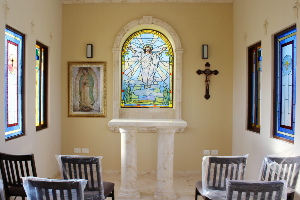 - Capilla con vitrales, altar y pisos de piedra labrada