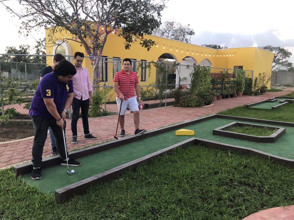 Un total de 18 hoyos de mini golf. El hoyo 18 termina junto al Bar del restaurante.